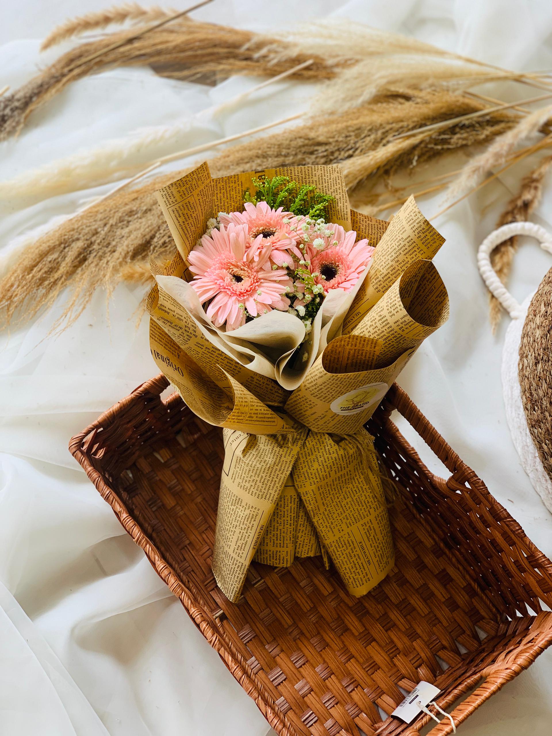A gentle burst of cheer and comfort, the Blush Harmony bouquet features six soft pink and cream daisies, symbolizing hope, healing, and brighter days ahead. Accented with airy baby’s breath and wrapped in blush-toned paper, this uplifting arrangement brings warmth and encouragement to someone on the road to recovery.
