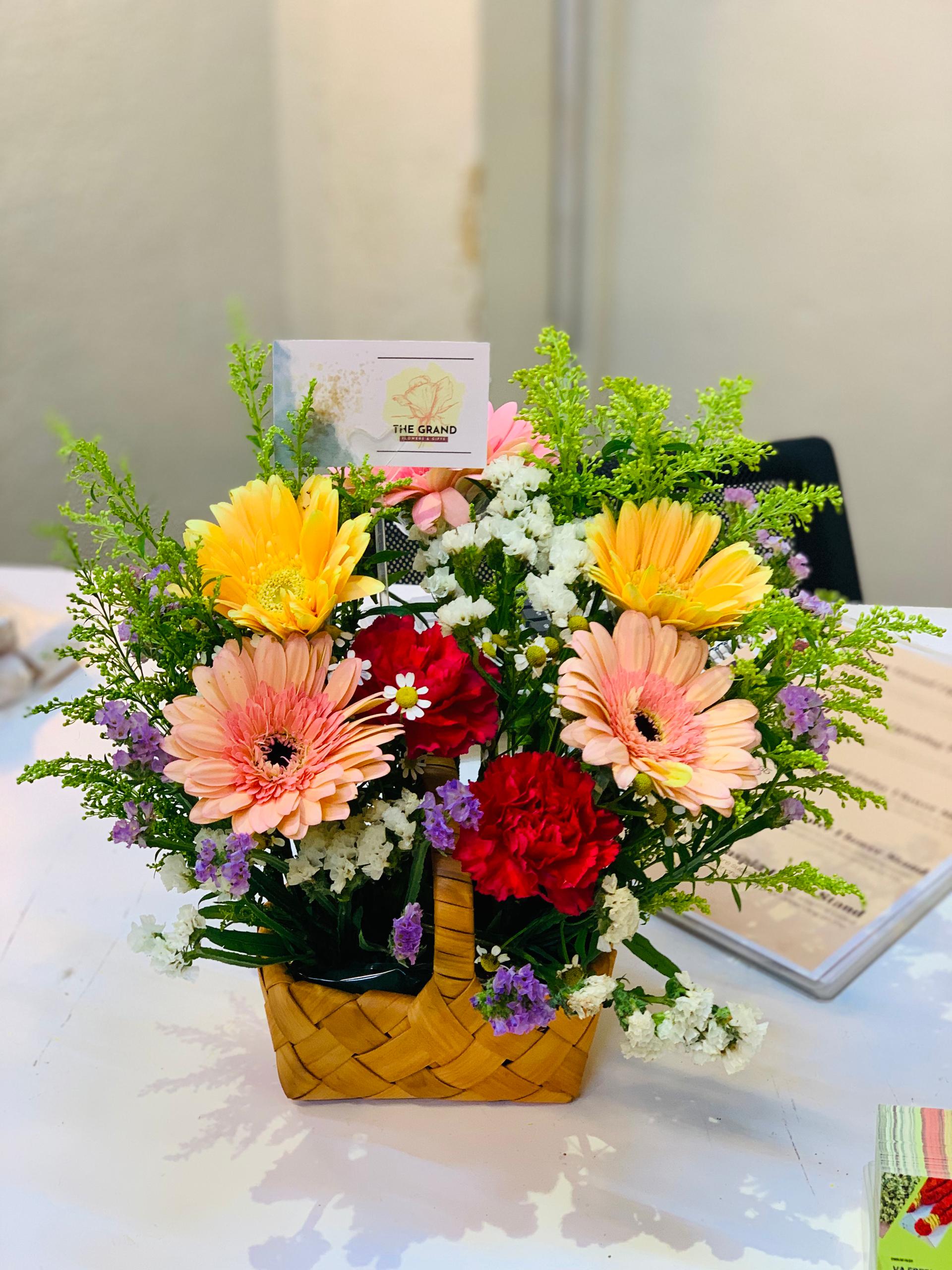 Bright and graceful, the Blossoming Charm flower basket features soft peach gerberas, delicate pink carnations, and fresh daisies, beautifully accented with vibrant seasonal blooms. Nestled in a rustic woven basket and finished with a charming bow, this arrangement radiates warmth, positivity, and heartfelt wishes — making it a thoughtful gift for life’s meaningful moments.
