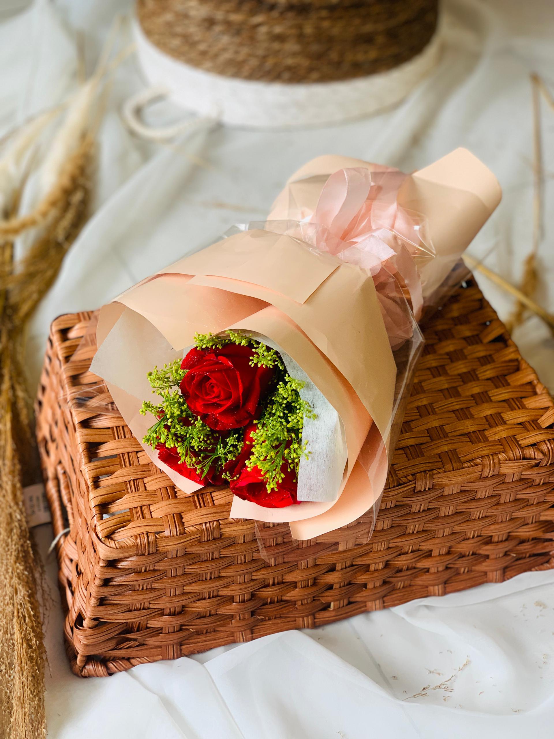 Elegant and classic, the Blushing Ember features a striking trio of premium red roses, symbolizing deep affection and timeless beauty. This charming arrangement is artfully accented with vibrant greenery and delicate yellow fillers, adding a touch of fresh texture. Wrapped in soft, peach-toned layered paper and finished with a matching ribbon, it radiates warmth and sincerity—making it a perfect gesture for life’s heartfelt moments.
