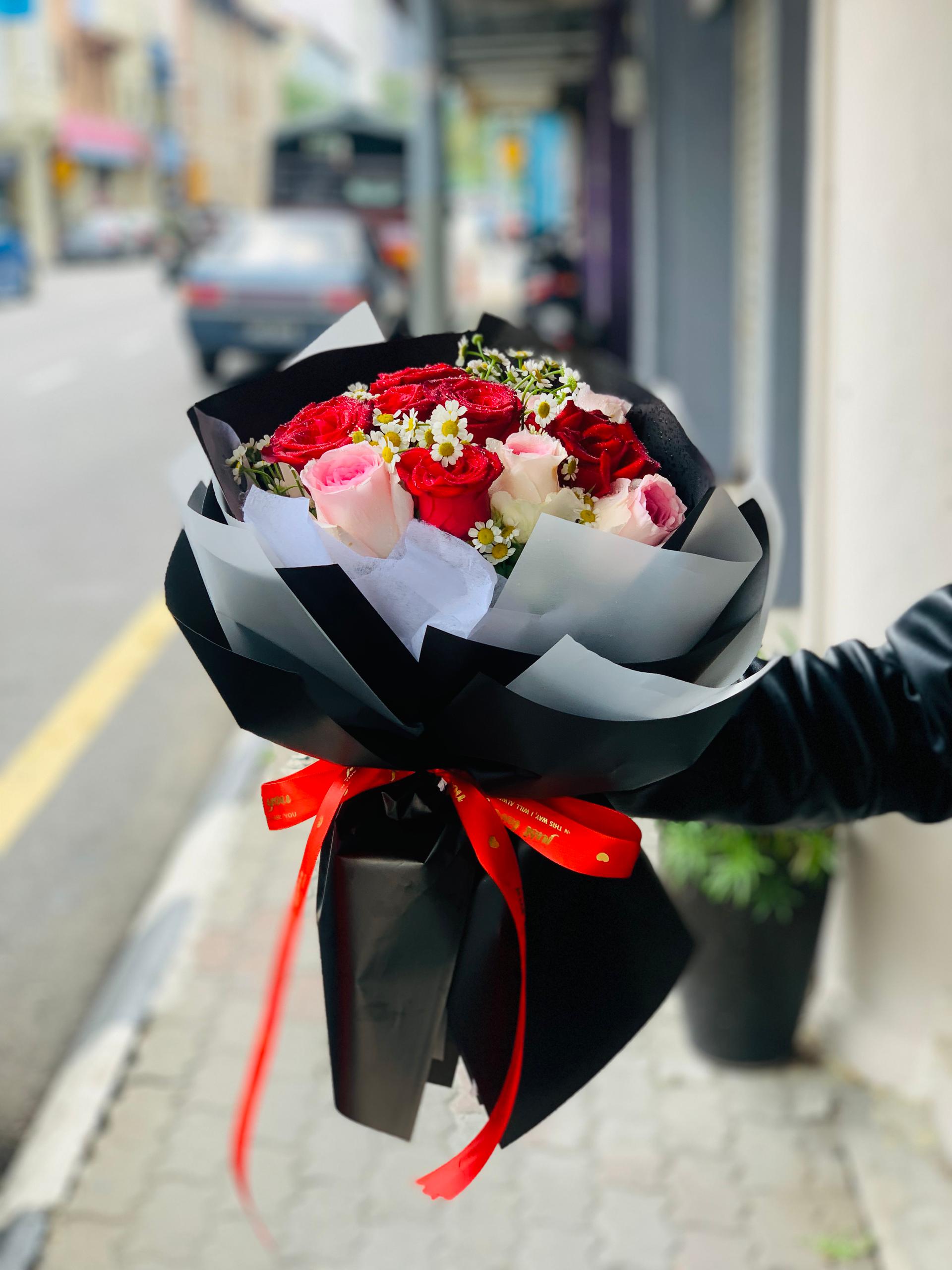 Charming and expressive, the Blushing Romance features a beautiful pairing of delicate pink roses and classic red roses. Interspersed with cheerful chamomile florets, this arrangement is wrapped in sleek, multi-layered black paper and tied with a vibrant orange-red ribbon, creating a modern contrast that highlights the natural beauty of the blooms.