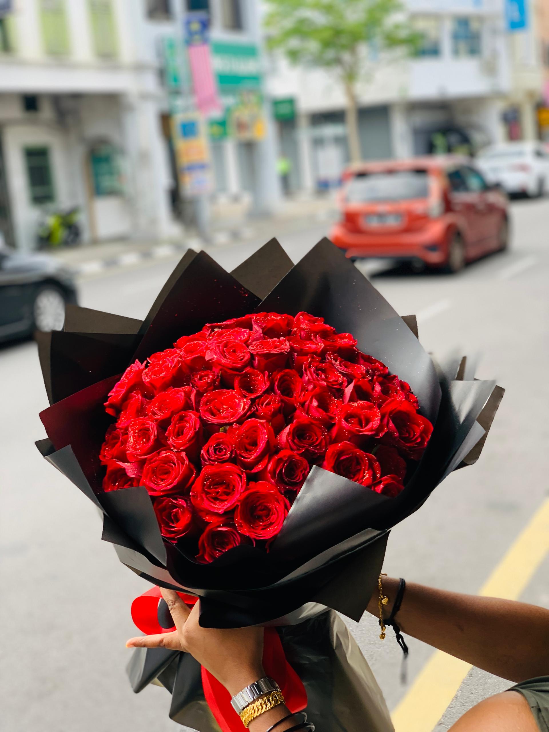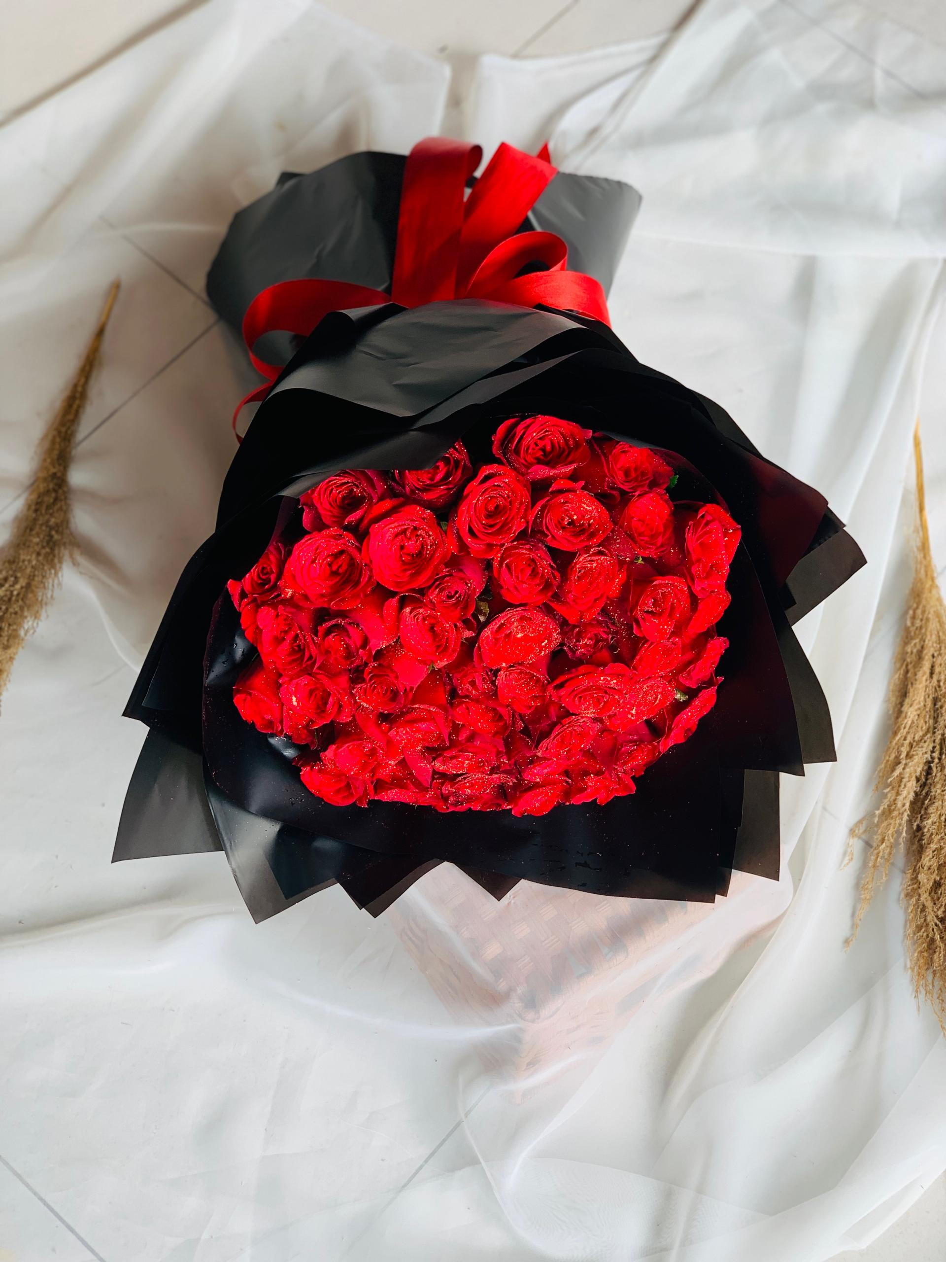 Magnificent and awe-inspiring, the Crimson Grandeur is a breathtaking masterpiece designed to make an unforgettable statement. This luxurious arrangement features 50 premium red roses, meticulously gathered to create a dense, velvety sea of deep crimson. Wrapped in sleek, sophisticated black paper and tied with a striking red ribbon, this bouquet radiates intense passion, elegance, and grand devotion.