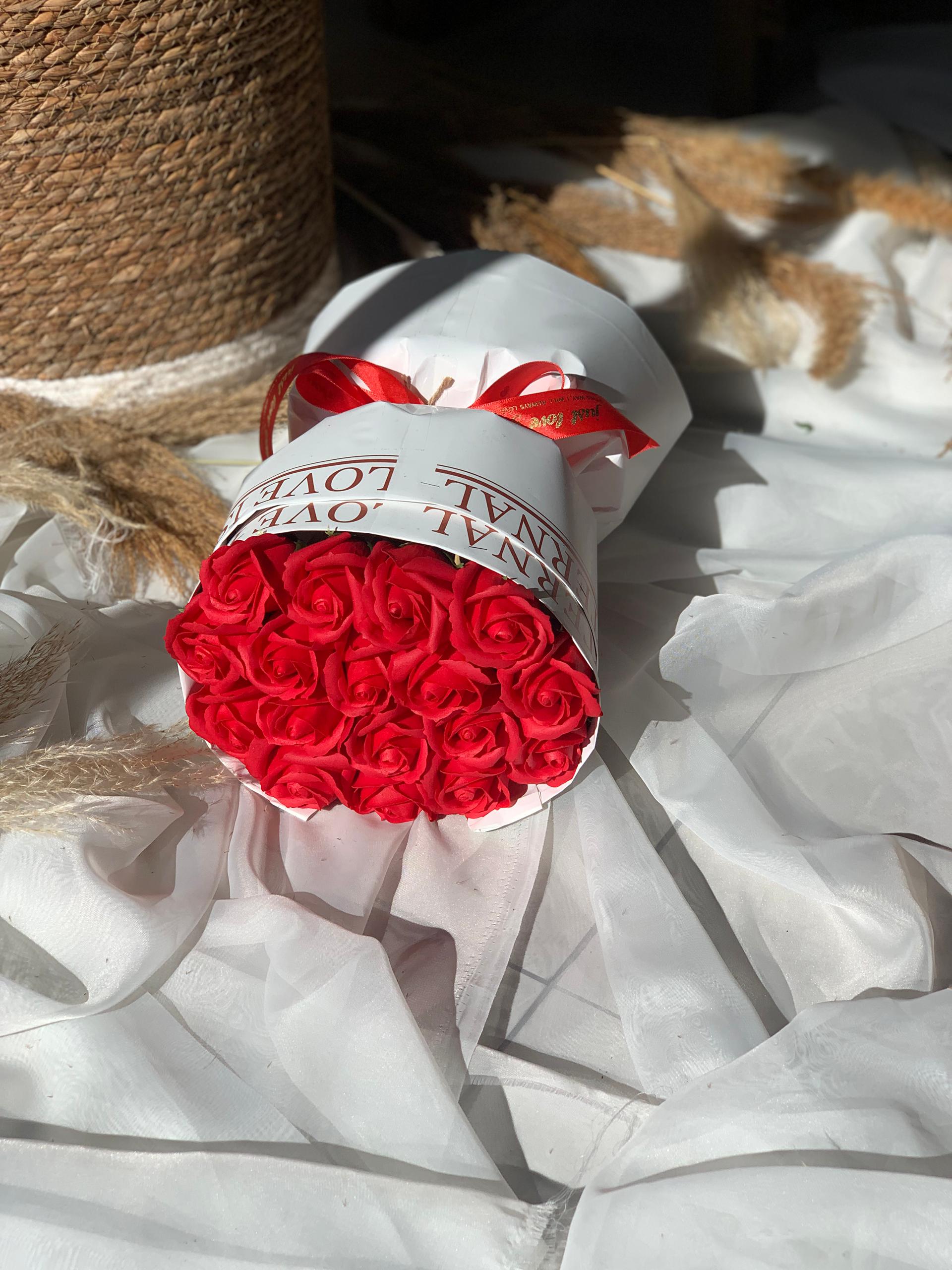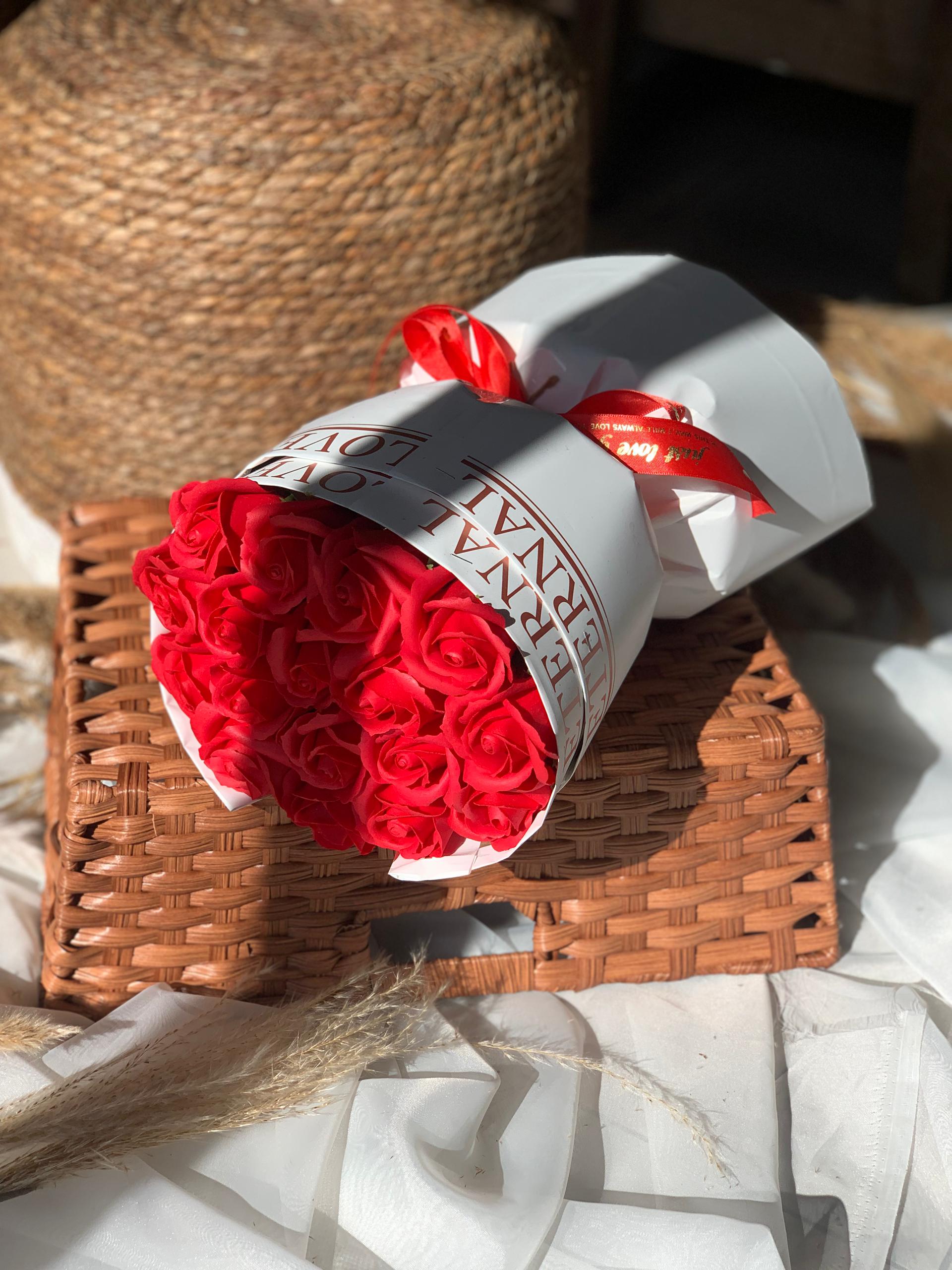Romantic and everlasting, the Eternal Passion bouquet features 17 lush red soap roses — each crafted to perfection and designed to last. A stunning symbol of deep love and devotion, this bouquet is perfect for grand gestures and timeless keepsakes.