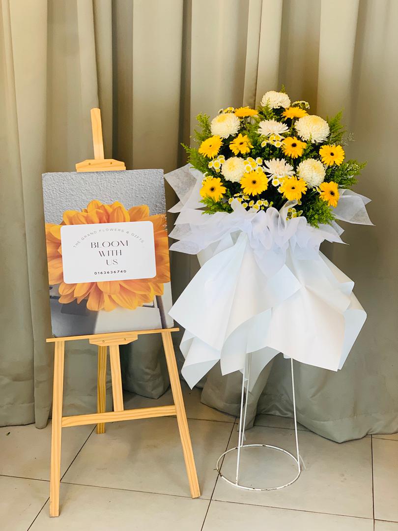 Dignified and serene, the Eternal Peace Stand is a respectful tribute designed to honor a cherished life. This grand arrangement features a harmonious blend of white one-head chrysanthemums and sun-up chrysanthemums, symbolizing purity and peace. Brightened by the gentle warmth of yellow daisies and accented with delicate white peacock fillers, the arrangement is elegantly framed in crisp white layered wrapping.