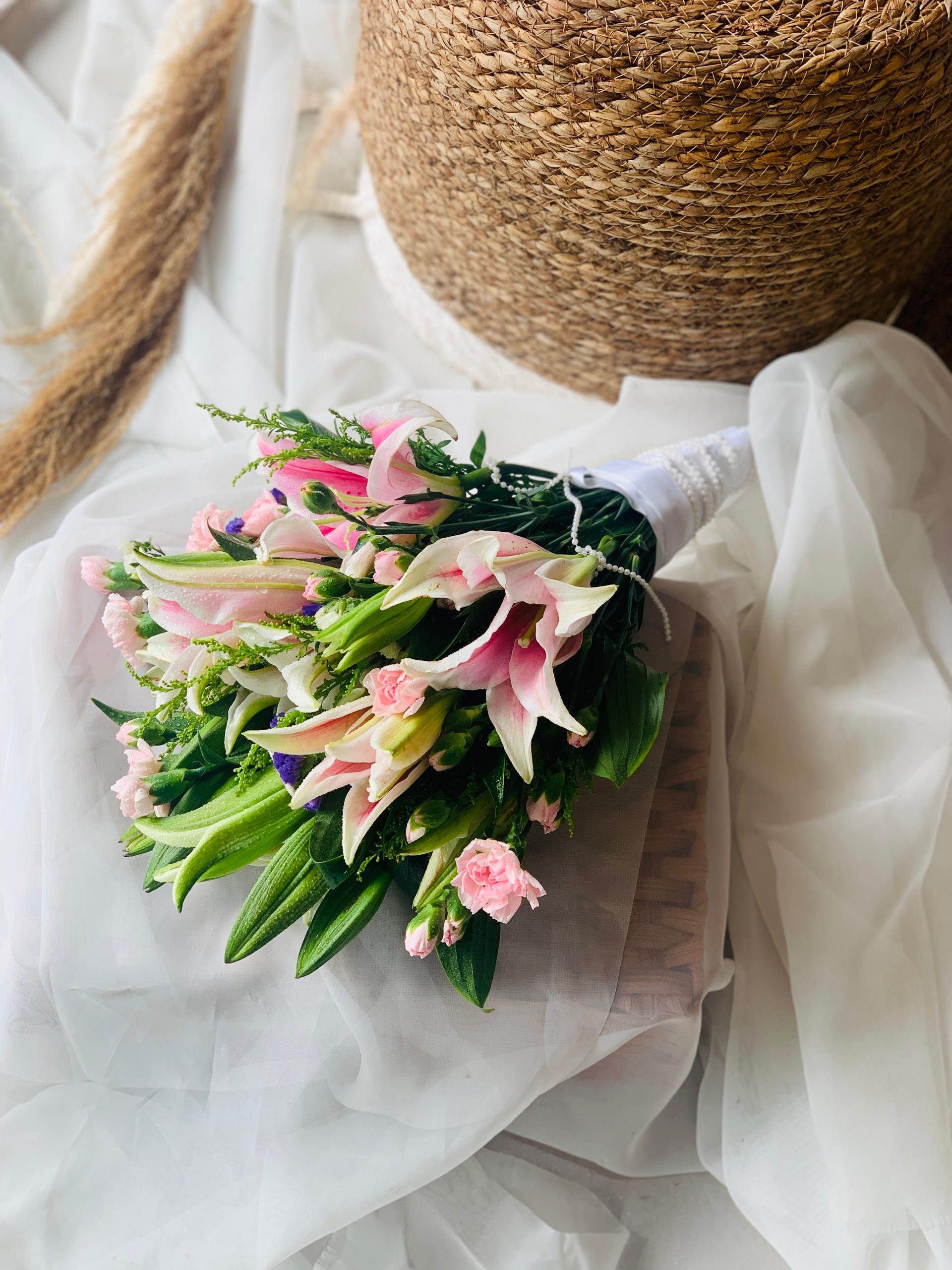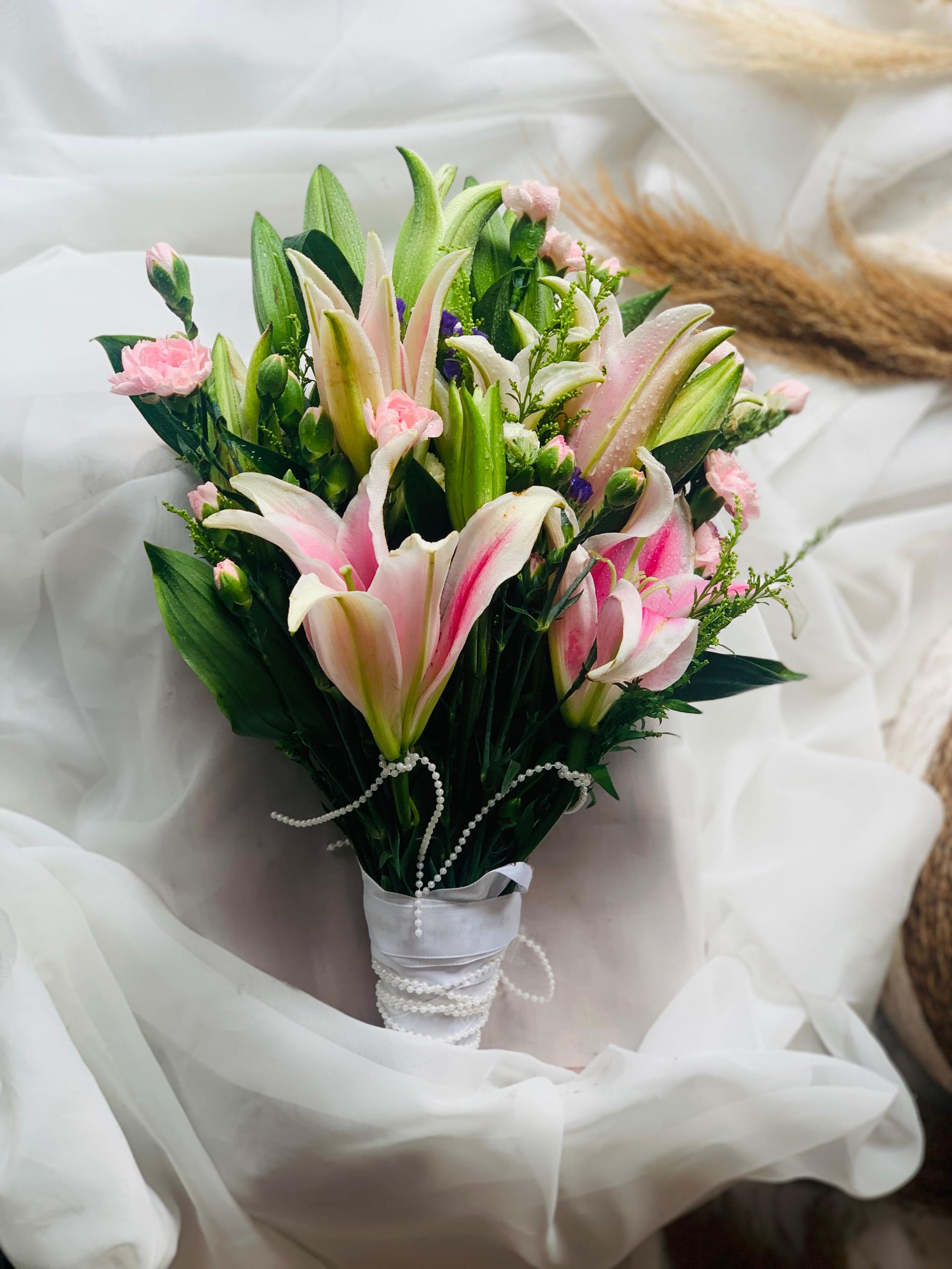 A truly unique bouquet that radiates modern elegance, the Ethereal Majesty bouquet features a captivating blend of majestic lilies and unique sprayed carnations. Artfully arranged with vibrant purple fillers and textured green peacock foliage, this sophisticated bouquet conveys a sense of refined beauty and timeless style, making it the perfect accessory for the modern bride.