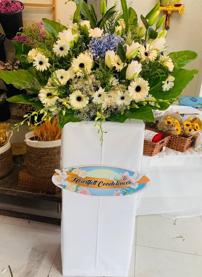 A truly heartfelt and comforting tribute, the Gentle Solace Stand features a serene blend of pristine white gerberas, elegant lilies, and delicate white chrysanthemums. A soft touch of blue hydrangea is woven throughout the arrangement, creating a peaceful contrast against the lush green foliage. This stand is thoughtfully designed to express a deep and respectful sympathy, offering a beautiful source of solace during a time of loss.