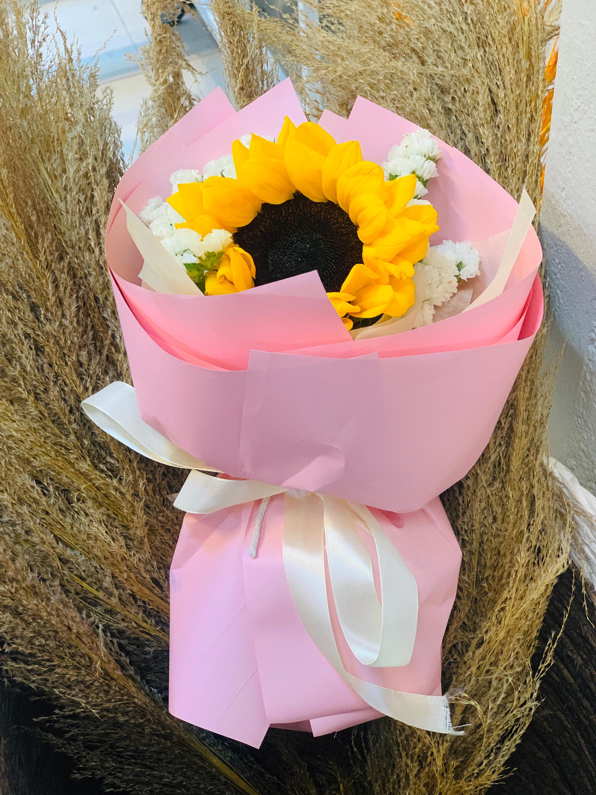 Bright and full of life, the Golden Joy features a magnificent, large sunflower nestled in a soft bed of white statice. Wrapped in vibrant candy-pink layered paper and tied with a silky cream ribbon, this arrangement radiates cheerfulness, longevity, and warmth. It is the perfect “pocket of sunshine” to celebrate a happy milestone or to lift someone’s spirits.