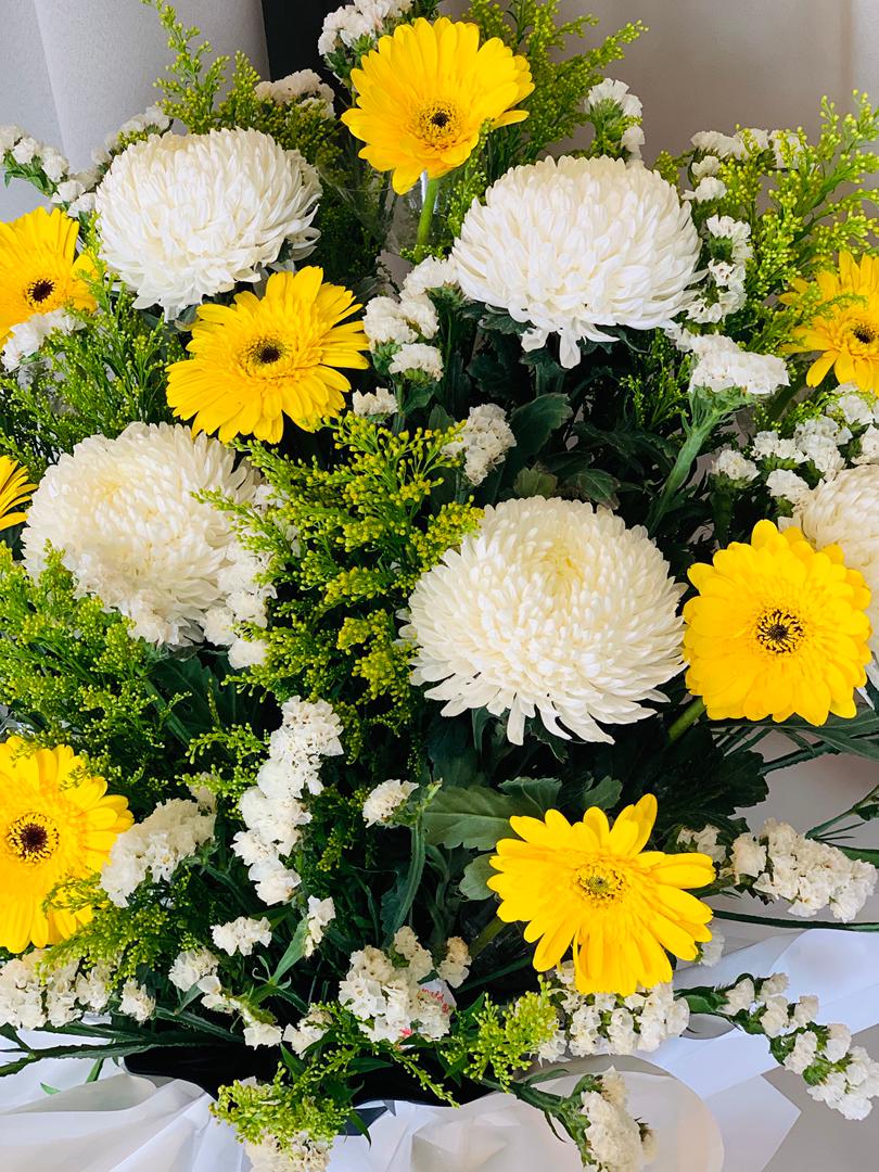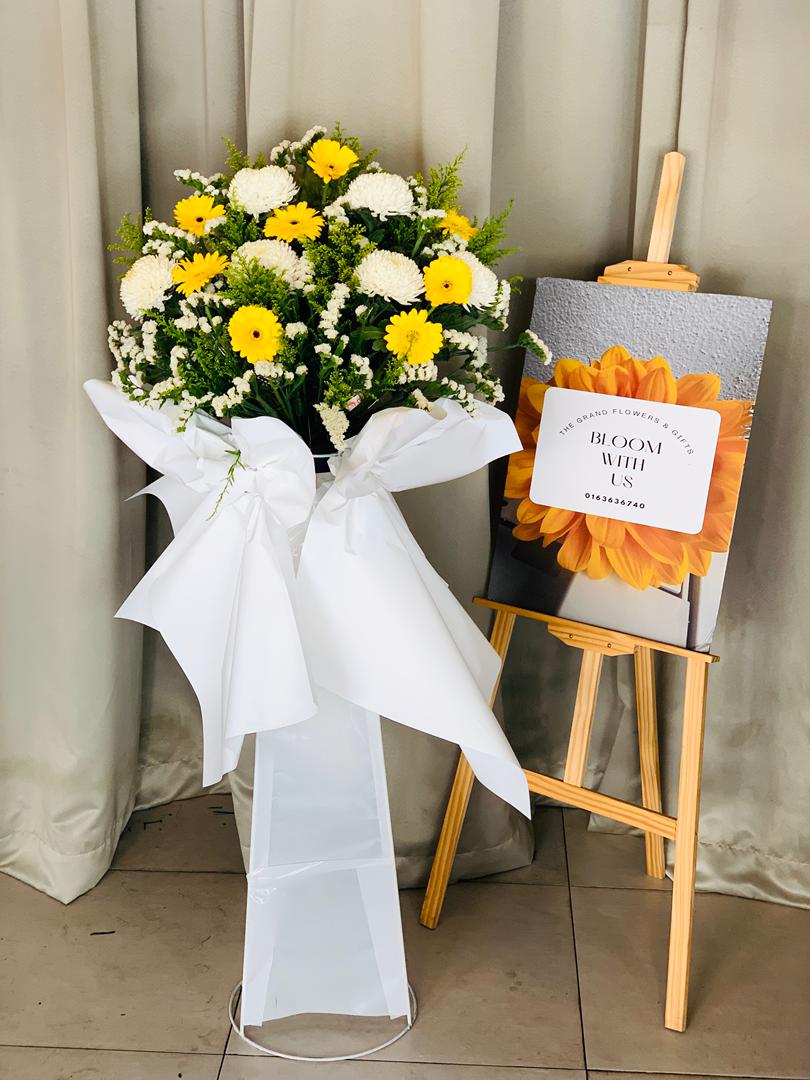 Dignified and respectful, the Golden Serena Stand serves as a bright yet peaceful tribute to a life well-lived. This grand standing arrangement features a harmonious blend of pristine white chrysanthemums, symbolizing purity and lamentation, beautifully contrasted by the warm, hopeful glow of yellow daisies. Accented with delicate white peacock fillers and resilient purple statice, the display is elegantly wrapped in crisp white layered fabric to offer comfort and solace.