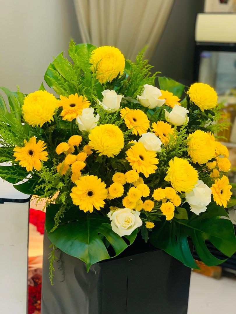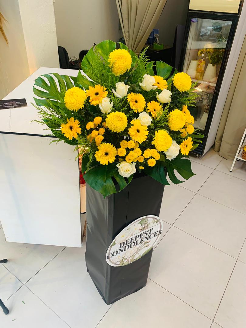 A heartfelt tribute of warmth and remembrance, the Golden Serenity condolence stand features a harmonious blend of bright yellow chrysanthemums, cheerful gerberas, and pure white roses. Symbolizing respect, comfort, and eternal love, this arrangement offers solace and hope during times of loss. Thoughtfully arranged with lush greenery, it serves as a graceful expression of sympathy and support.