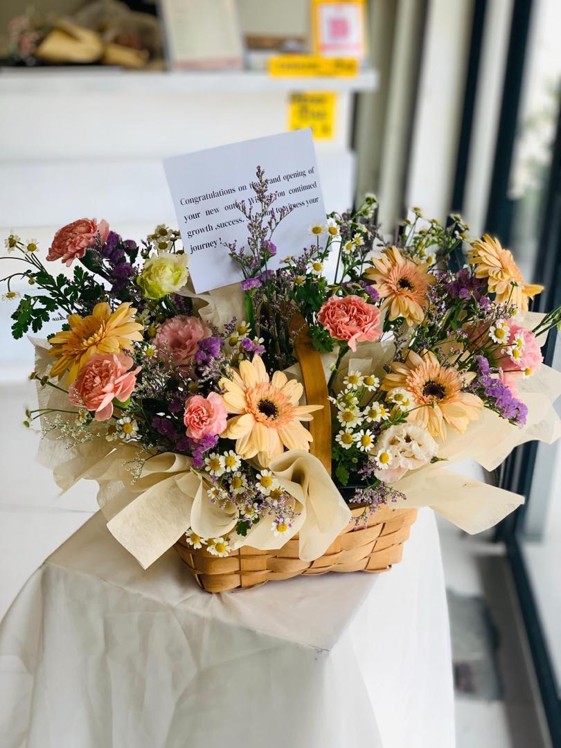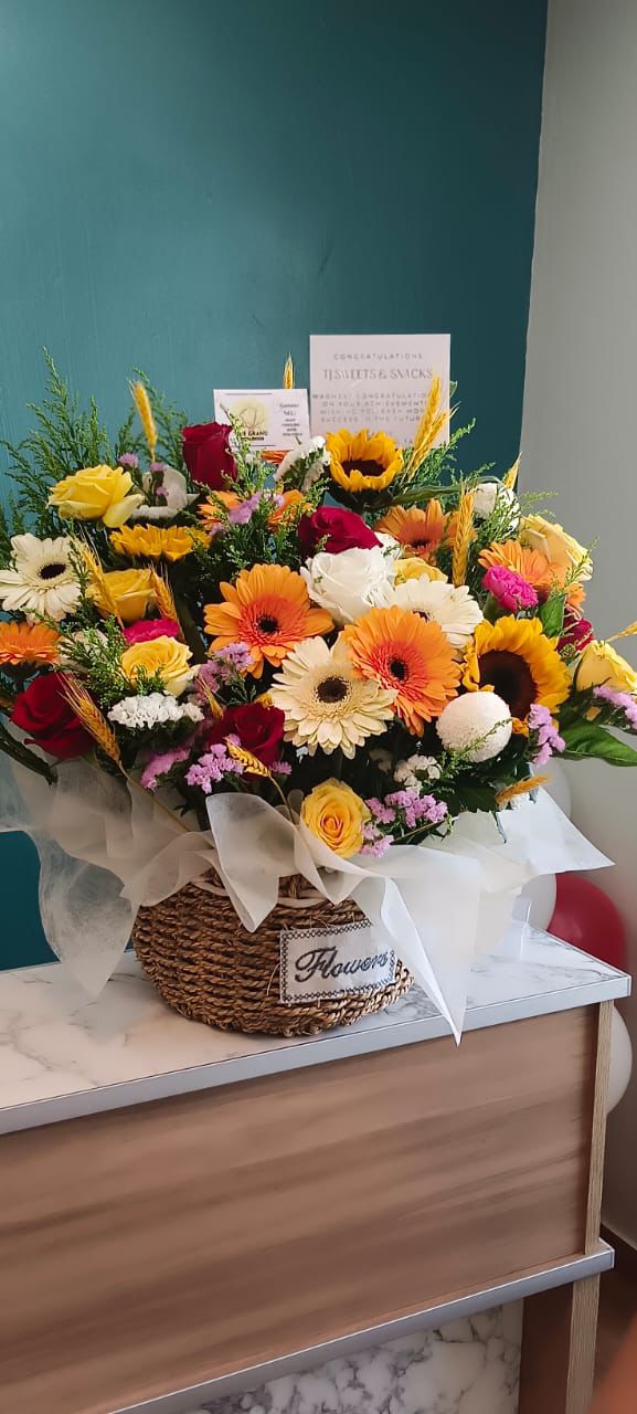 Vibrant and full of life, the Golden Sunrise basket bursts with the warmth of sunflowers, fiery red roses, vivid orange gerberas, golden button poms, and delicate white fillers. Arranged in a rustic woven basket, it radiates joy and positivity, making it a heartwarming gift for any celebration.
