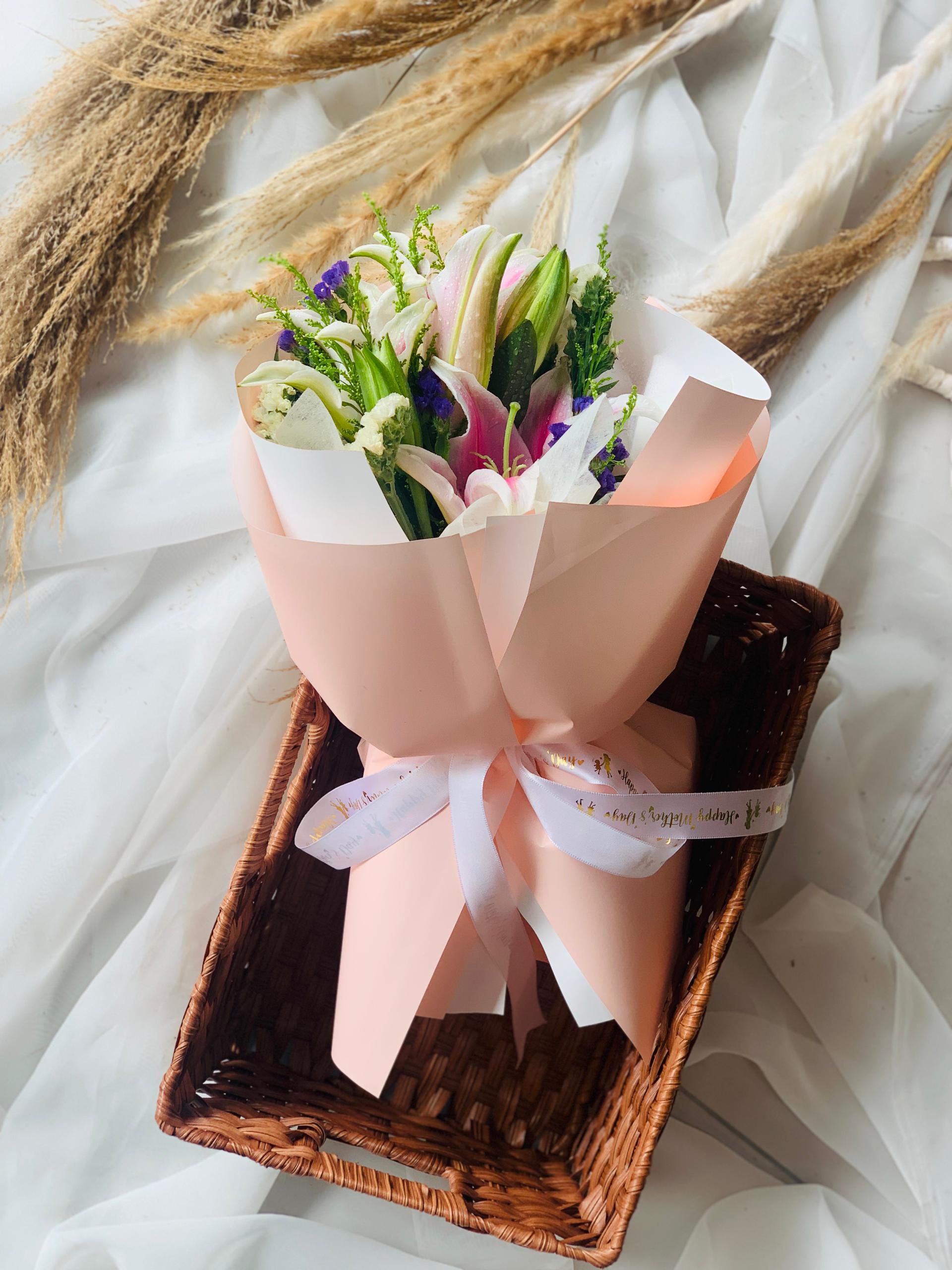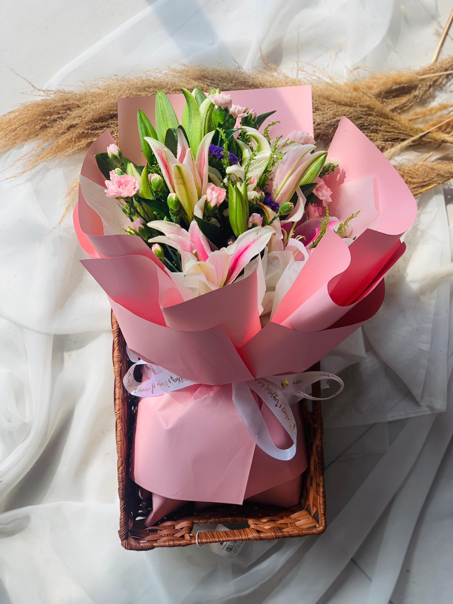 XL Pink Lilies, Soft Pink Sprayed Carnations, Peacock Green Filler, Purple Statice
