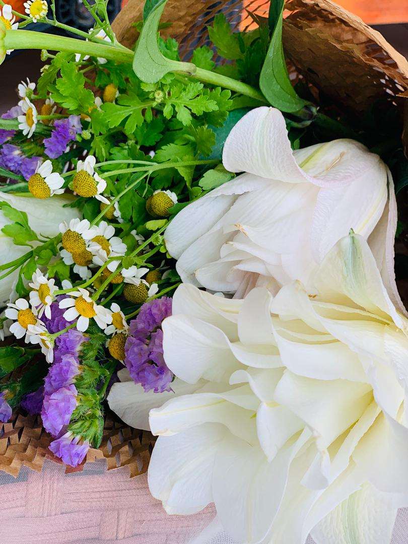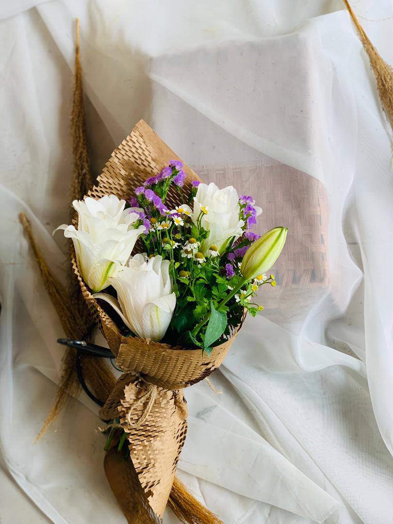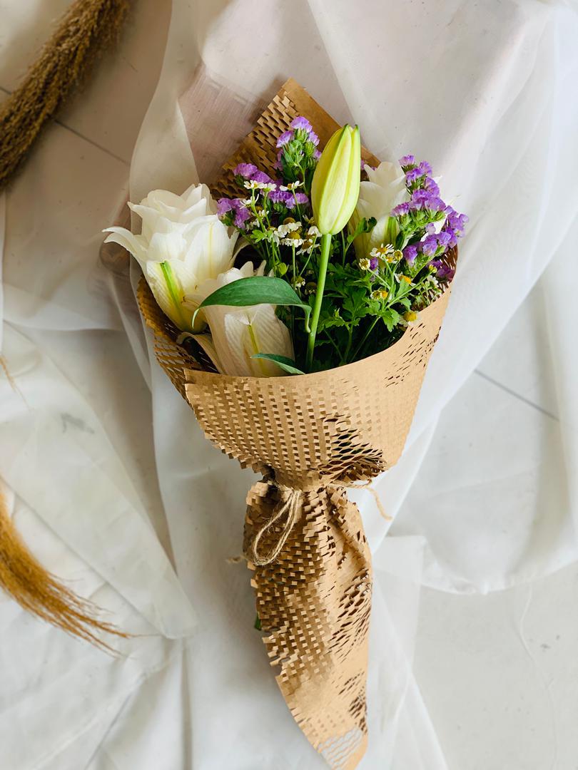 Elegant and serene, the Purity & Grace features a stunning combination of pristine white lilies and soft roses, beautifully accented with cheerful chamomile. Complemented by vibrant purple statice and wrapped in eco-friendly honeycomb kraft paper, this arrangement radiates peace, sincerity, and timeless beauty—making it a sophisticated gift for life’s most meaningful moments.