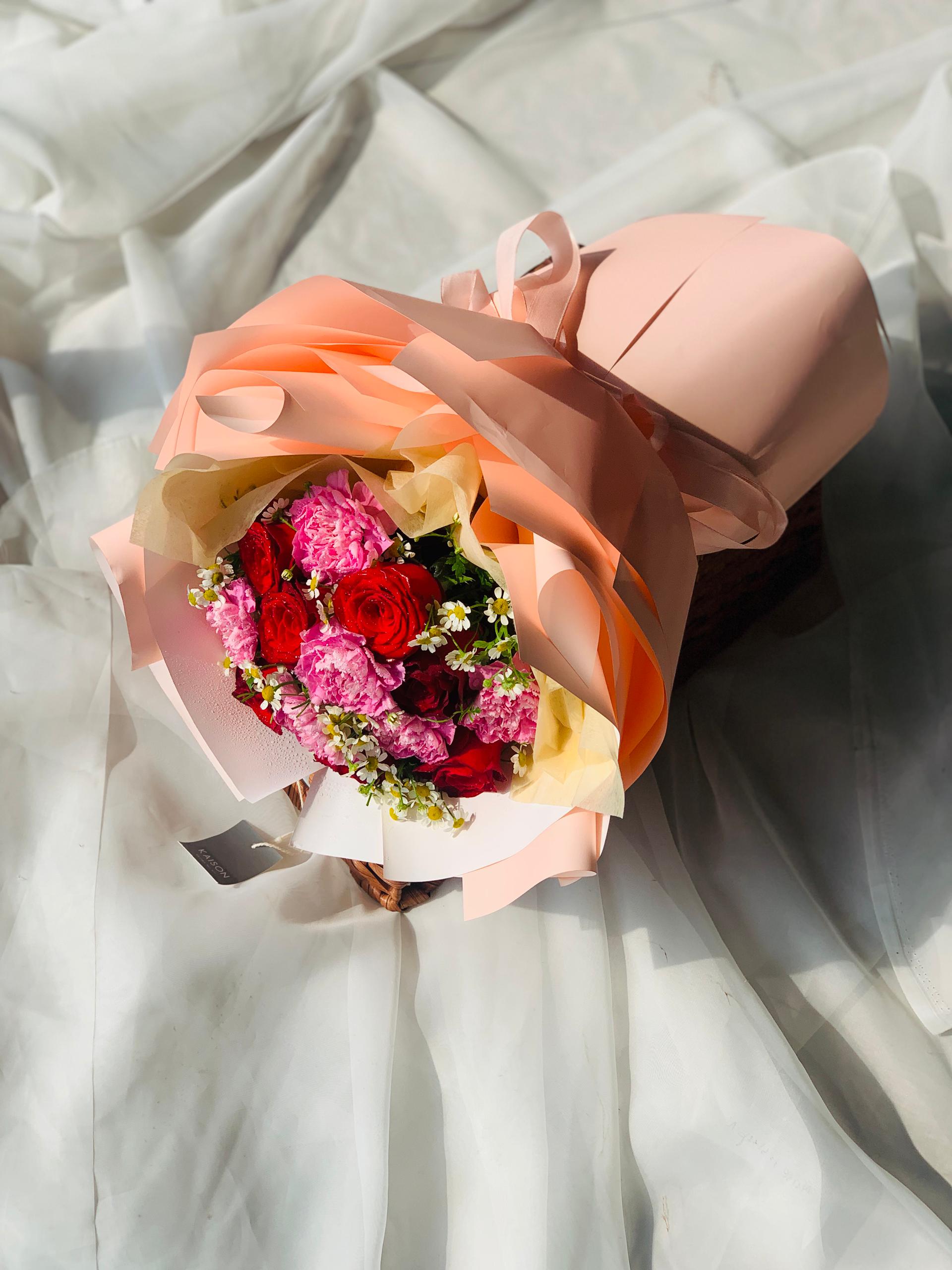 Soft and radiant, the Scarlet Serenity features a charming blend of vibrant red roses and fluffy pink carnations, beautifully accented with delicate chamomile florets. Wrapped in stylish, layered peach-toned paper and finished with a matching ribbon, this arrangement radiates warmth, grace, and heartfelt affection—making it a sweet gesture for life’s most cherished moments.