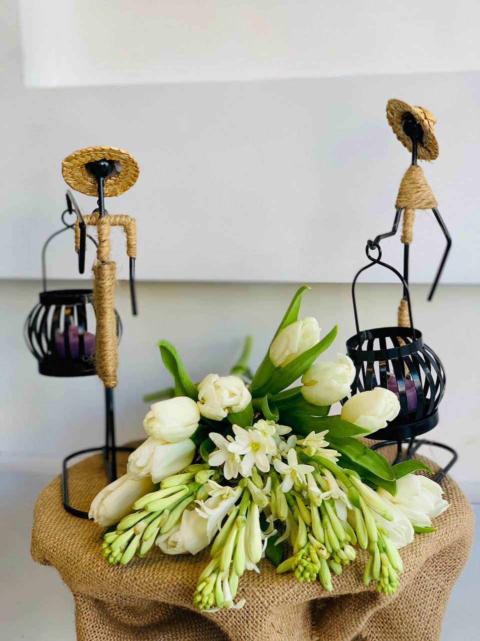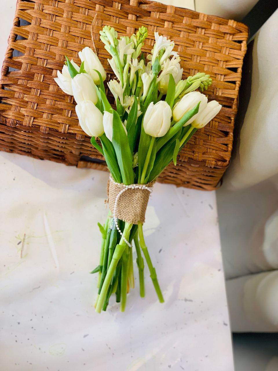 A vision of pristine beauty, the Snowfall Serenity bridal hand bouquet showcases a harmonious blend of pure white tulips and delicate white Tuberose,, symbolizing new beginnings and everlasting love. The stems are elegantly bound with natural burlap and adorned with a delicate string of pearls, adding a touch of rustic charm and refined grace. This enchanting arrangement exudes tranquility and sophistication, making it the perfect accompaniment for a bride’s special day.