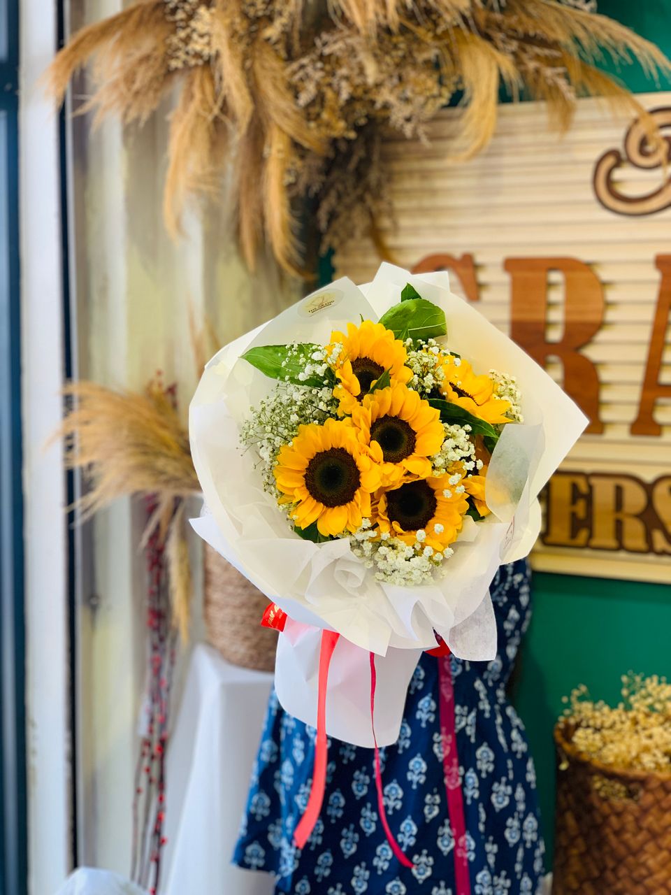 Radiant and full of warmth, the Sunlight Cheer features 6 premium sunflowers, symbolizing happiness, loyalty, and longevity. Nestled in a soft cloud of delicate baby’s breath, these bold blooms are wrapped in crisp white premium paper and finished with a vibrant red ribbon. This arrangement brings a touch of sunshine to any room and is guaranteed to brighten someone’s day.