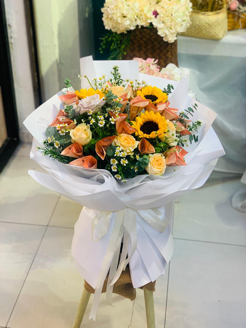 Sunflowers, Roses, Chamomile, Eucalyptus, Cash Notes (Denomination customizable)